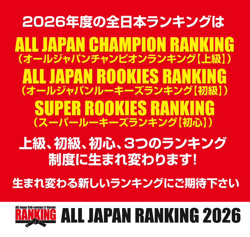 今年度より新たに新設された、空手歴1年未満の初試合、入賞歴のない選手の為の初心ランキング制度。上半期(4月〜9月)で一区切り、下半期(10月〜翌年3月)で一区切りと、2期に分けてそれぞれにランキングポイントを付けて順位を決めます。